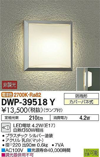 本体サイズ: 径□220 出90mm主な仕様: DAIKO 防雨型■AC100V■光源寿命40000時間■調光器併用不可7VA定格光束 210lm消費電力 4.7WRa82白熱灯60W相当素材/色/仕上:プラスチック シルバー塗装 アクリル 乳白(マット)(ランプ付)■DWP-39518Yの取付方法■検索コード 20150612■ジャンル インテリア・寝具・収納 ライト・照明器具 壁掛け照明・ブラケットライト■カテゴリ 照明器具 エクステリアライト ポーチライト